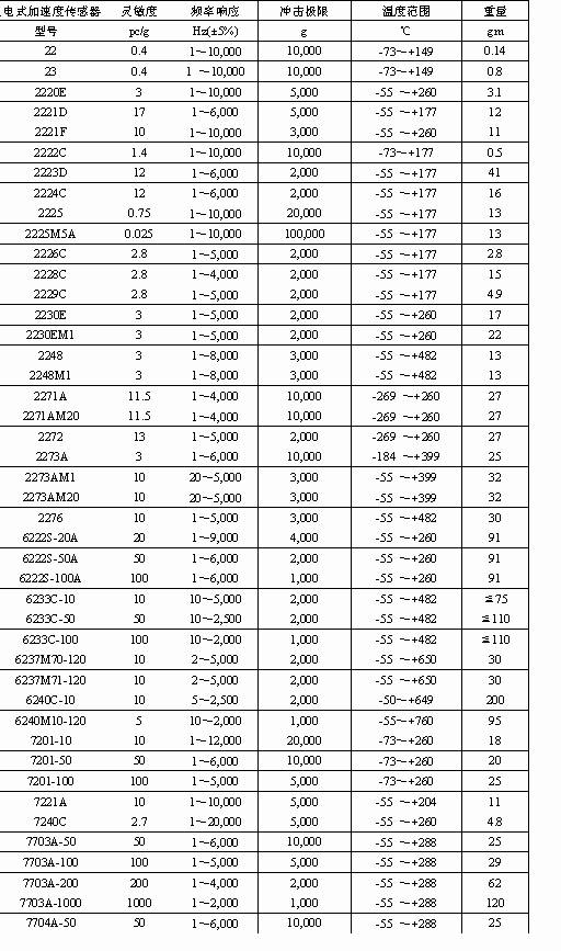 電式加速度傳感器 型號 22 23 2220E 2221D 2221F 2222C 2223D 2224C 2225 2225M5A 2226C 2228C 2229C 2230E 2230EM1 2248 2248M1 2271A 2271AM20 2272 2273A 2273AM1 2273AM20 2276 6222S-20A 6222S-50A 6222S-100A 6233C-10 6233C-50 6233C-100 6237M70-120 6237M71-120 6240C-10 6240M10-120 7201-10 7201-50 7201-100 7221A 7240C 7703A-50 7703A-100 7703A-200 7703A-1000 7704A-50